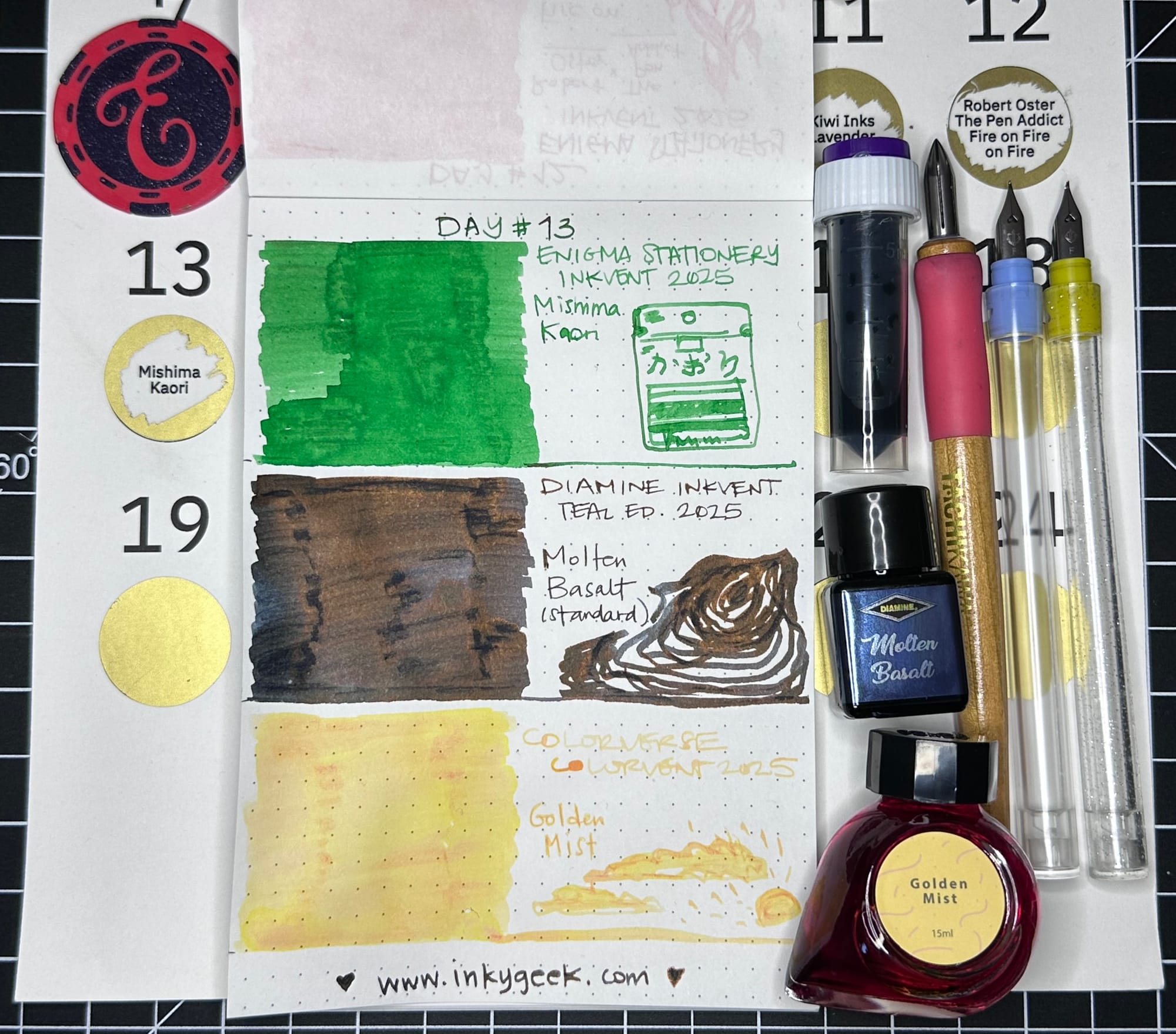 Colorverse Colorvent's Day 13 Golden Mist is a strange one. It's very pale and desaturated, and has these pools of orange-red-pink that appear as it dries. It's not entirely illegible, and doesn't give the same, uh, organic vibes as Day 7's Diamine in Blush as the base colour is a bright, warm yellow. I don't really know what to do with this one. It's so very light. I can't imagine what sort of pen it would work in, aside from using for highlighting or ink painting. Which is a totally valid use. I do appreciate ink makers taking risks like this. I tried to doodle a misty sunrise. The door to Day 13 says simply, "Golden Mist: Particles in the air scatter sunlight into a veil of golden haze."