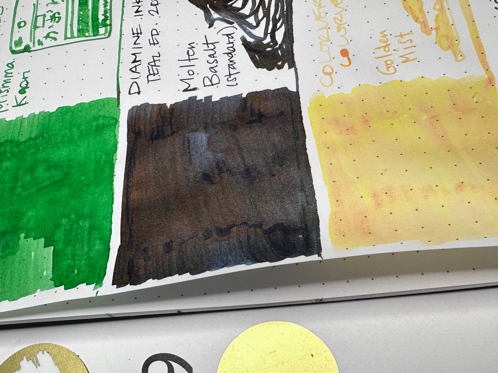 Day 13 for Diamine Inkvent Teal Edition is in Molten Basalt, labelled as a standard ink. I found, as photographed, it showed a lot of brown/black sheen and some lighter patches of shading. The overall colour is a dark, dark rich blue/navy-black that is hard to see with the sheen even in writing. It is an unusual sheening blue ink. Molten basalt is your gloopy, oozy lava, not the huge fountains of spurting boulder lava. I tried to doodle a lava floe, but it ended up looking somewhat like a mussel shell.