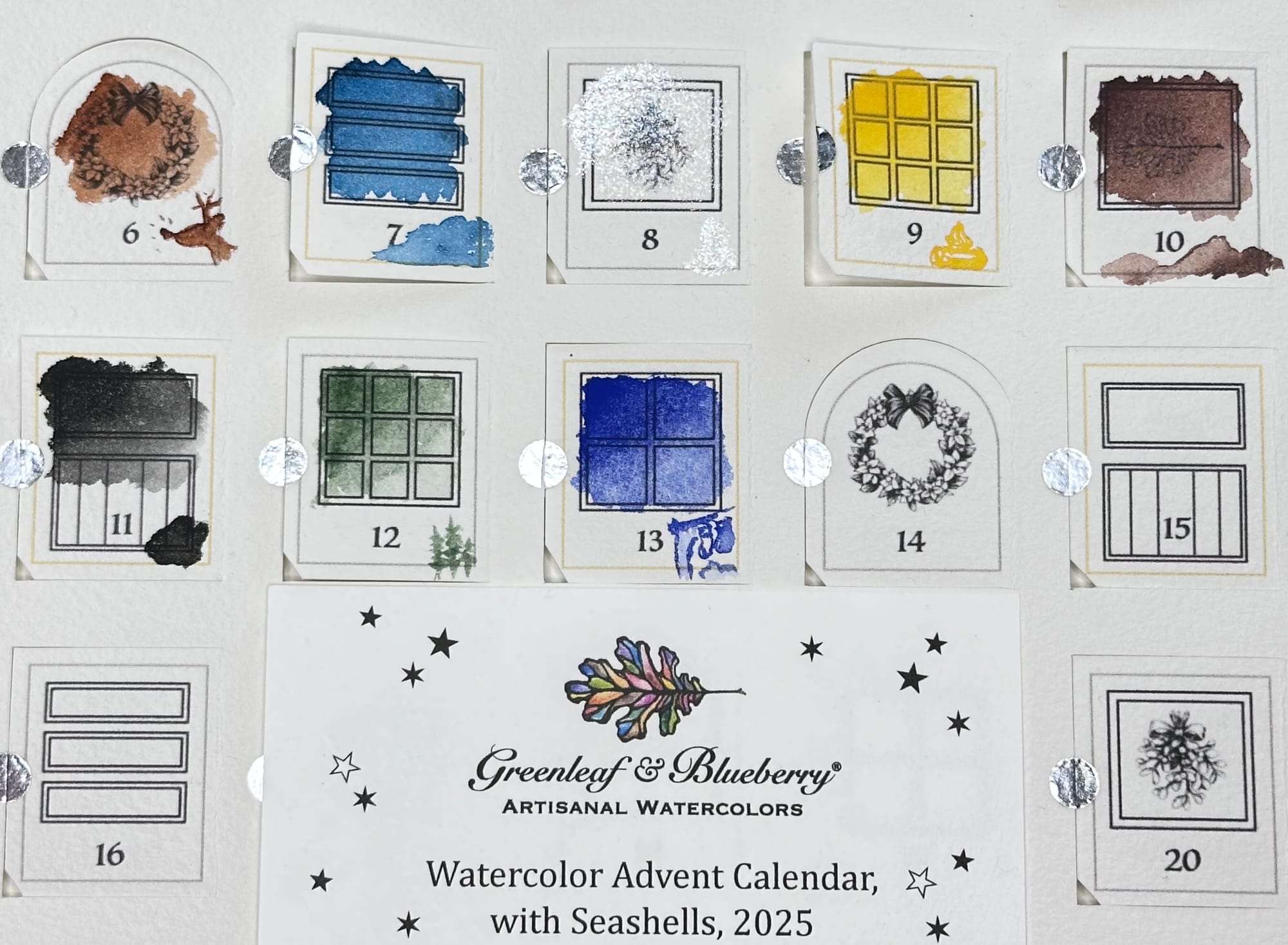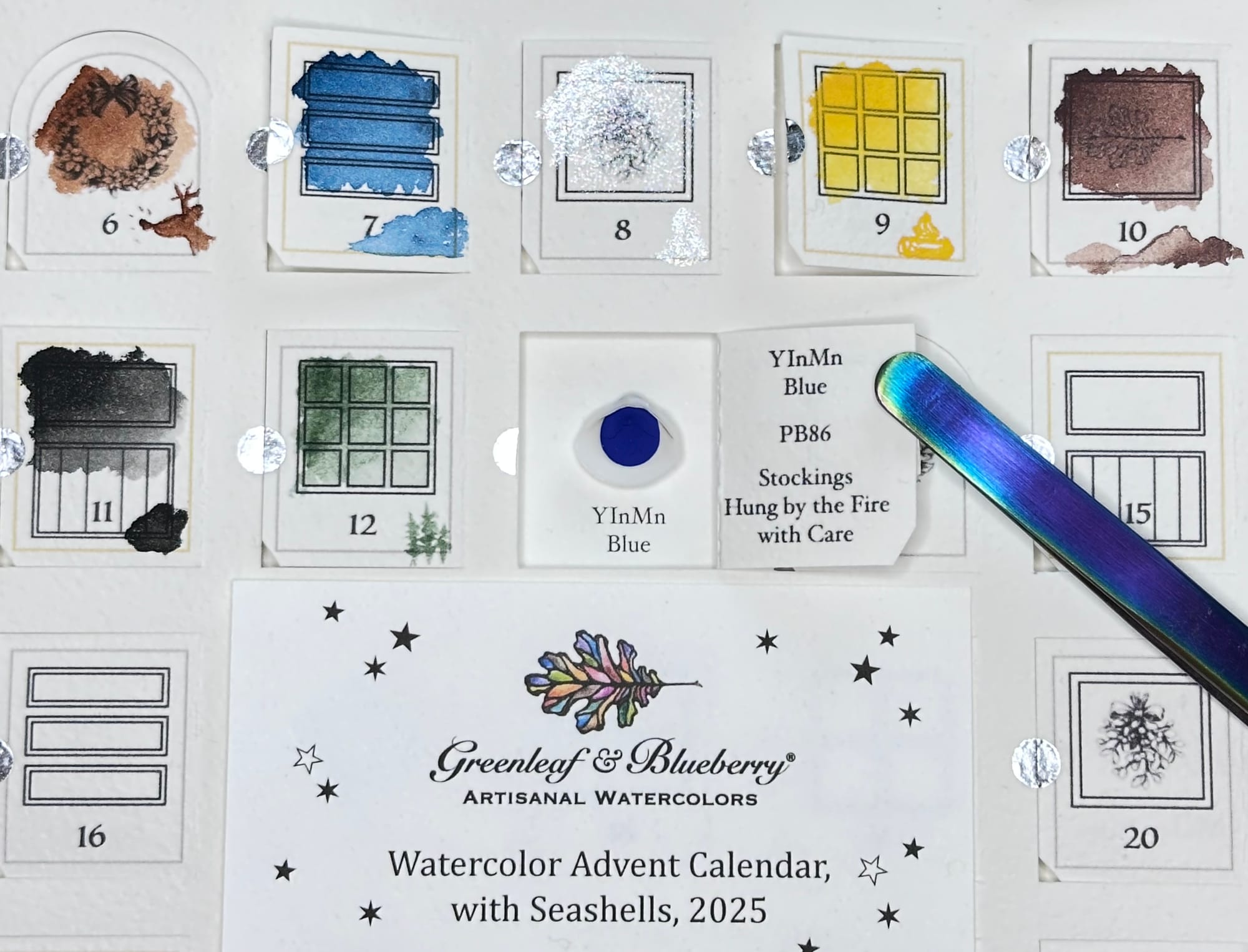 Day 13 in the Greenleaf & Blueberry Watercolour advent in shells was a real surprise! It's YInMn Blue, one of the most recent blue pigments discovered - in 2009! It's named for the components that make it up: Yttrium, Indium, Manganese. It's a very new, very vibrant, and very expensive pigment. The story of it's discovery & the subsequent commercialisation (some guys always gotta make number go up) is worth a deep dive. It's labelled as PB86. Here's an in depth review of another watercolour's brand from Parka Blogs that talks more about the pigment.