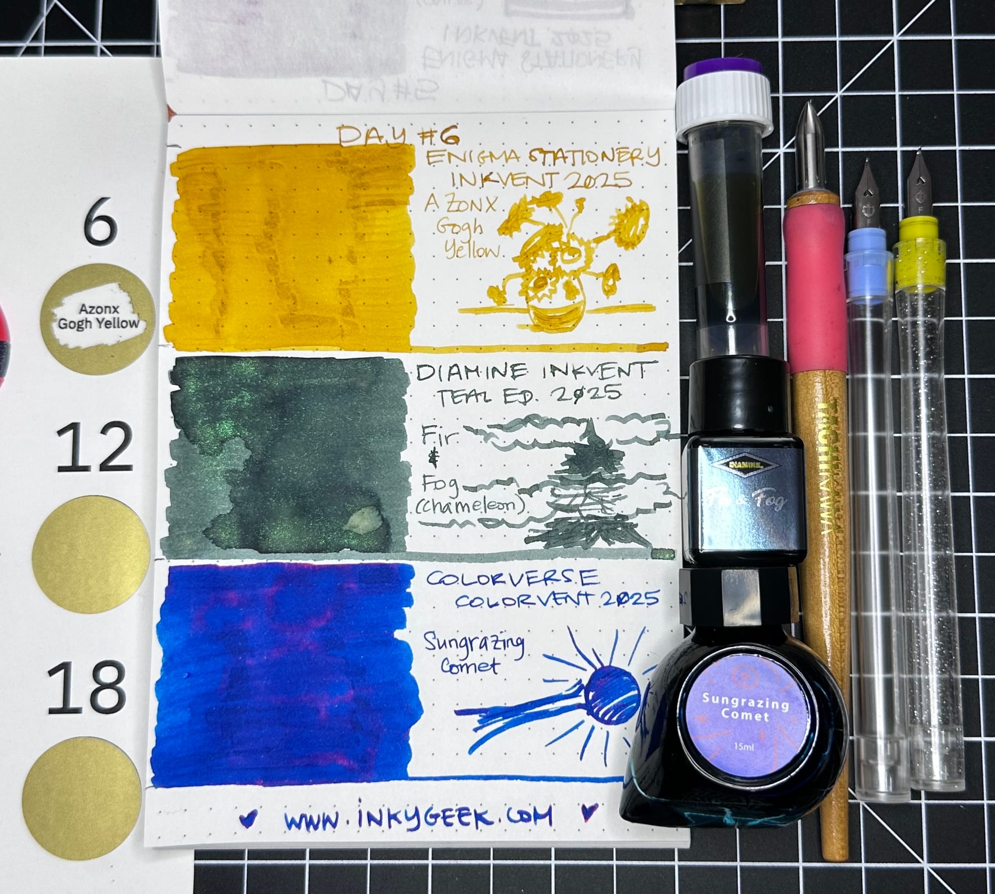 Starting with Enigma Stationery's Inkvent 2025 in AZONX Gogh Yellow. Another AZONX (x Sailor) ink, this time in a buttery slightly ochre yellow that has areas of darker shading in the heavier application areas. It's surprisingly legible in the writing and, like most Sailor inks, is well behaved and lubricated. The doodle is an interpretation of Van Gogh's Sunflowers.