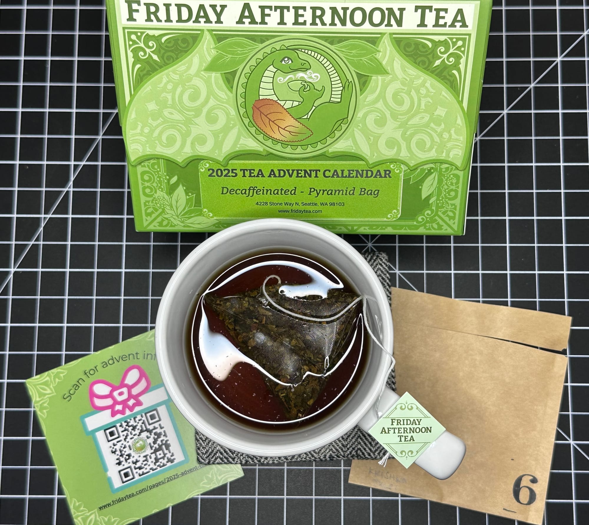 Finally, we have Friday Afternoon Tea's Decaf advent in pyramid bags day 6 tea, Krishna Tulsi.