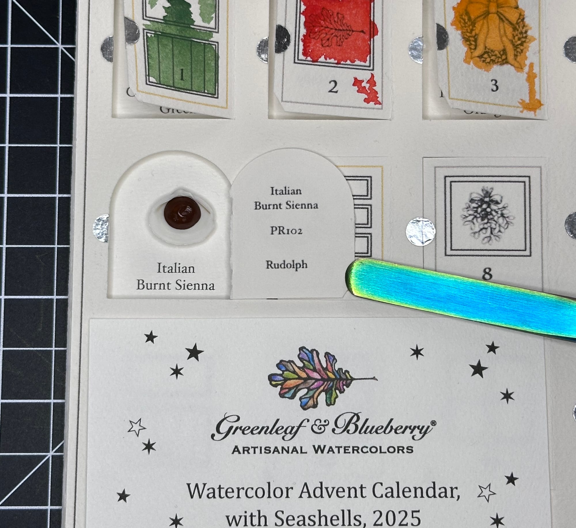 This watercolour, from what I can tell, is unavailable in pans or the main line at Greenleaf & Blueberry. It was in two different palettes (both not for sale right now). We're lucky to have so many unreleased paints to try in this calendar! The paint is Italian Burnt Sienna, a dark reddish brown with the pigment number of PR102. There are other paints called Burnt Sienna, but they are a different pigment. From what I understand, the pigment is an earth colour iron oxide that is heated and it changes the tone of the powdered pigment.