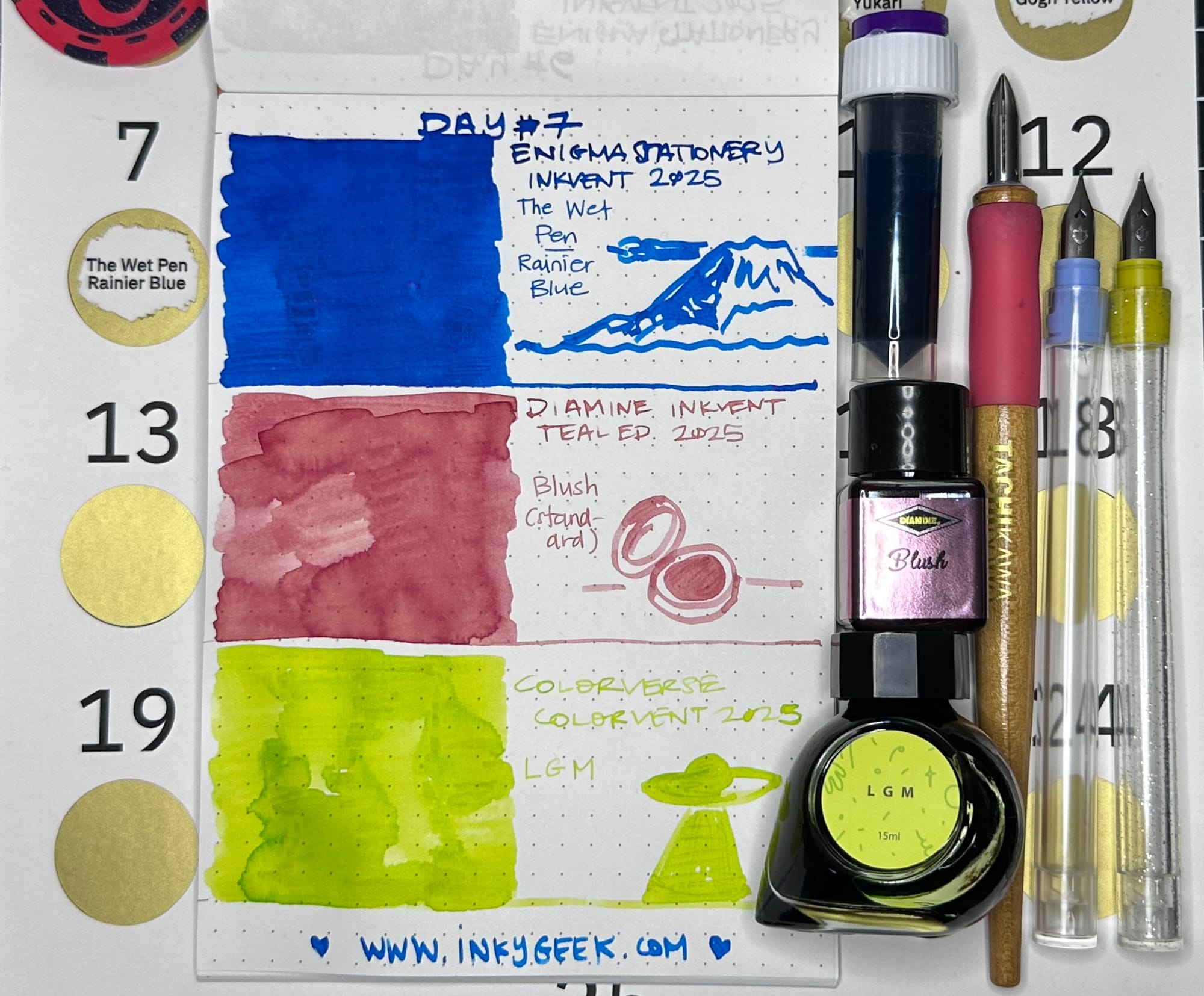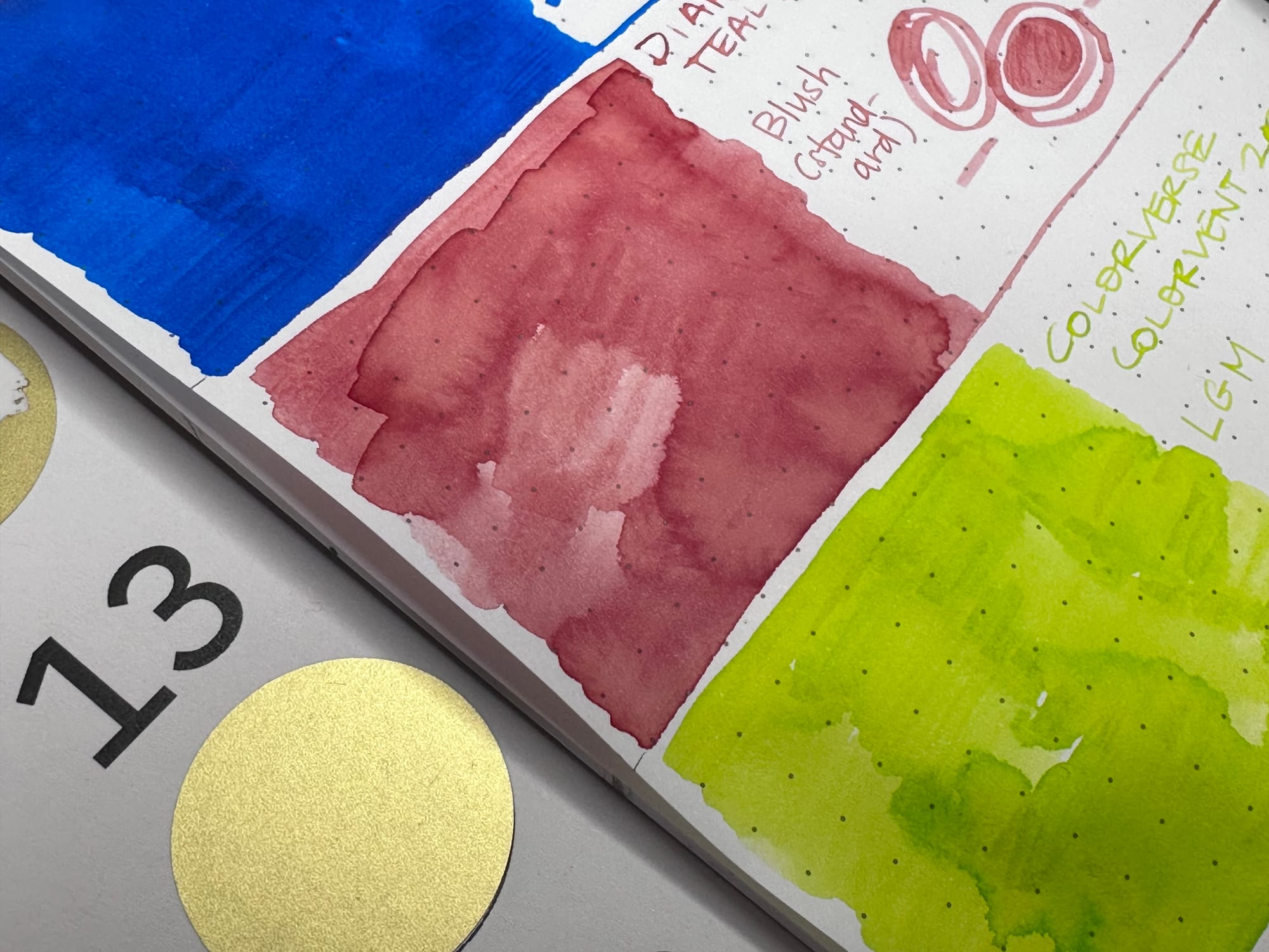 Next up is the unexpected one. Diamine Inkvent Teal Edition day 7 is in Blush, a standard ink. It applied VERY watery and strange, almost like I had something on the Kakimori nib tainting the colour. It goes on brownish with some yellow in it, too. Not at all what I was expecting. I shook the sample, washed all my nibs, dumped/refilled my rinse water, and tried again. Nope. That is just how this ink applies. We're getting a rare, wet photo in progress to hopefully better show the desaturated, watery and brownish yellow spots this swatch had (the overview is not colour accurate).