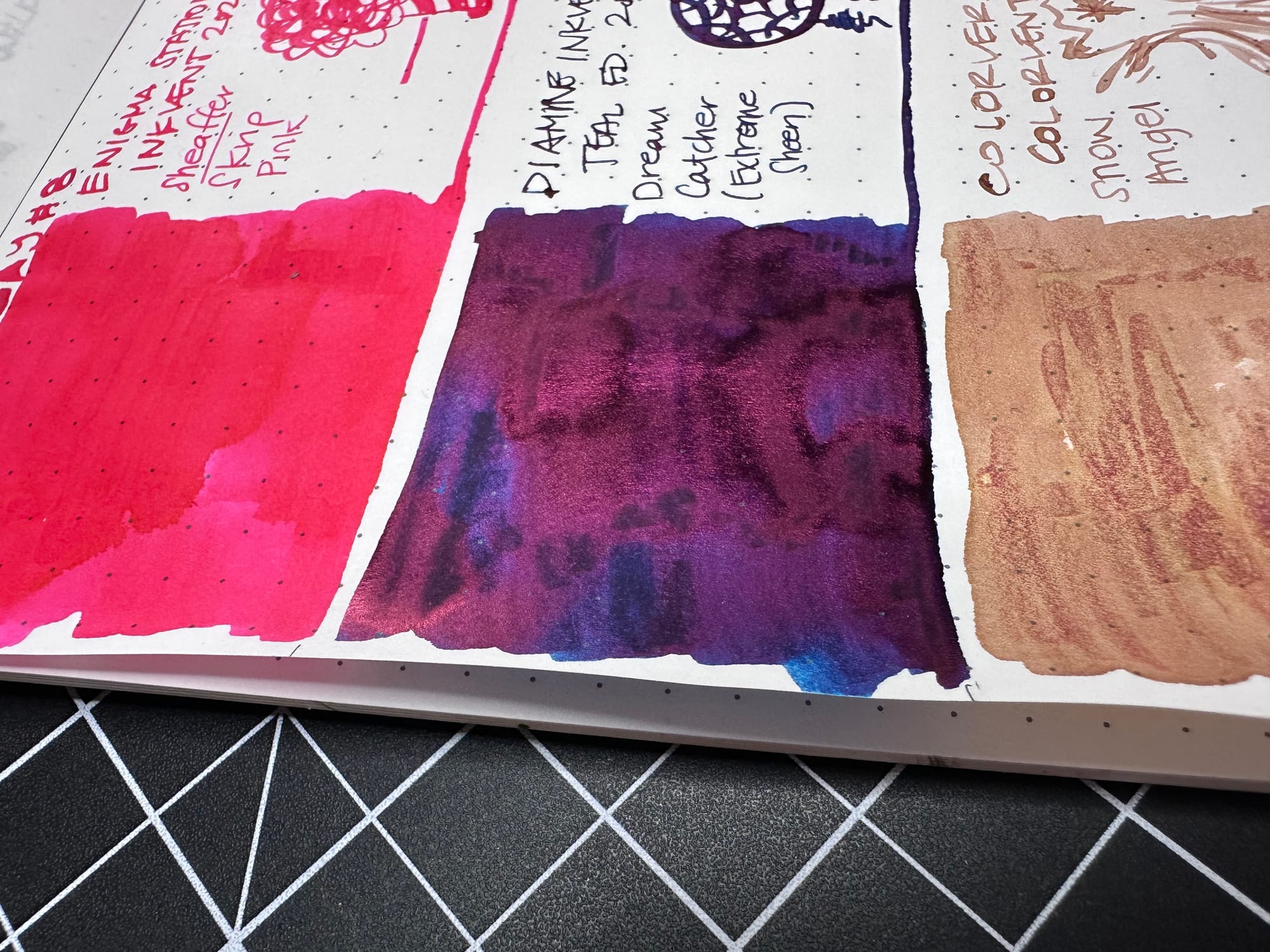 Diamine Inkvent Teal Edition 2025 is Dream Catcher (extreme sheen). This is yet another (dark) blue with red sheen. We're up to how many already? This one is EXTREME sheen, so it's mostly red/pink with some background blue. It takes a long time to dry and feels thick on the nib due to the sheen. I doodled a dream catcher, which I won't comment on the appropriateness of.