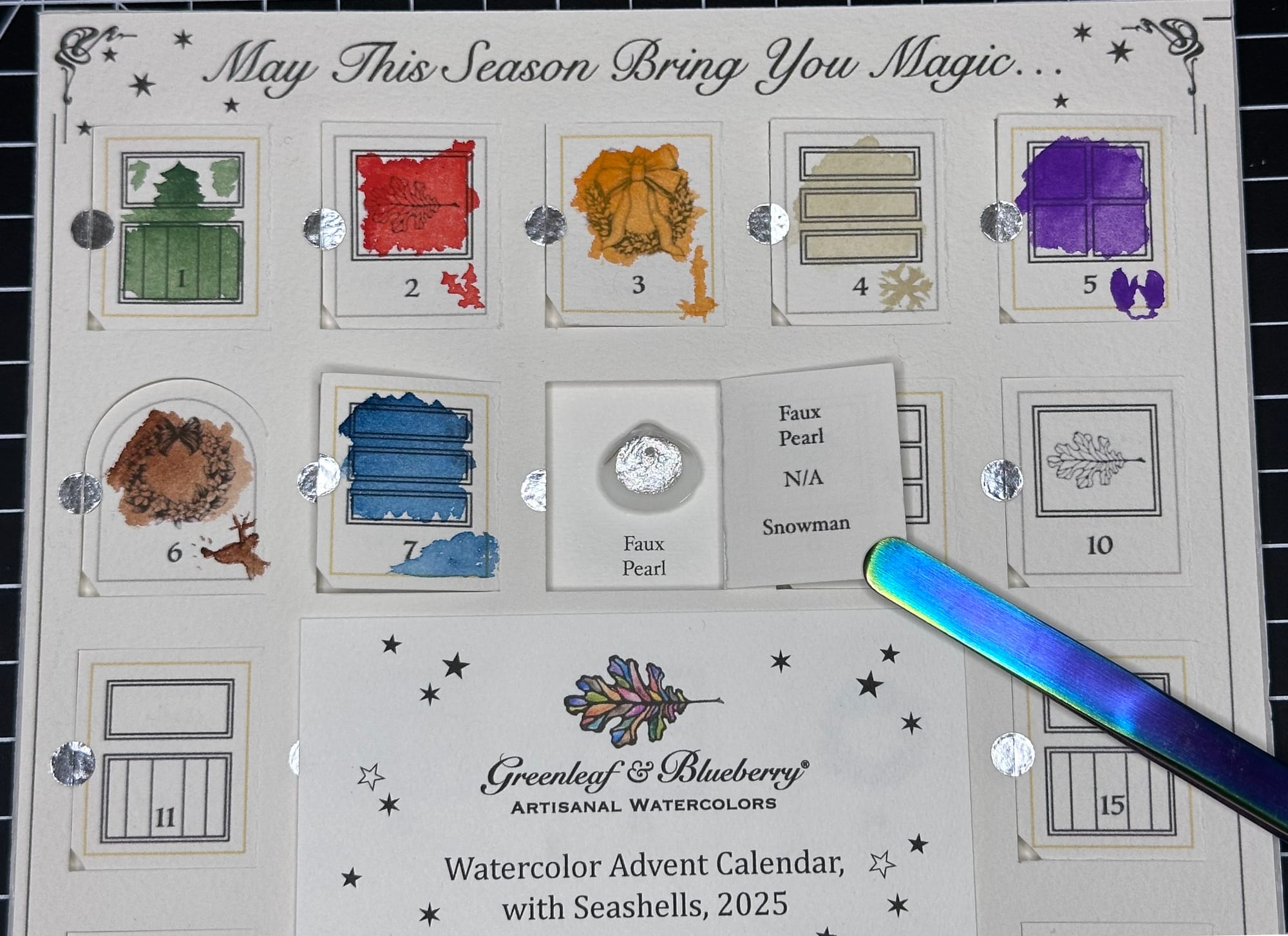 The Day 8 for the Greenleaf & Blueberry Watercolour Advent Calendar 2025 (with seashells) is Faux Pearl. There's no pigment number for this one. It's a super shiny, sparkly silver in the pan (shell). The doodle suggestion is a Snowman. This paint was hard to see on the off-white watercolour paper, as you'll see in the next photo.