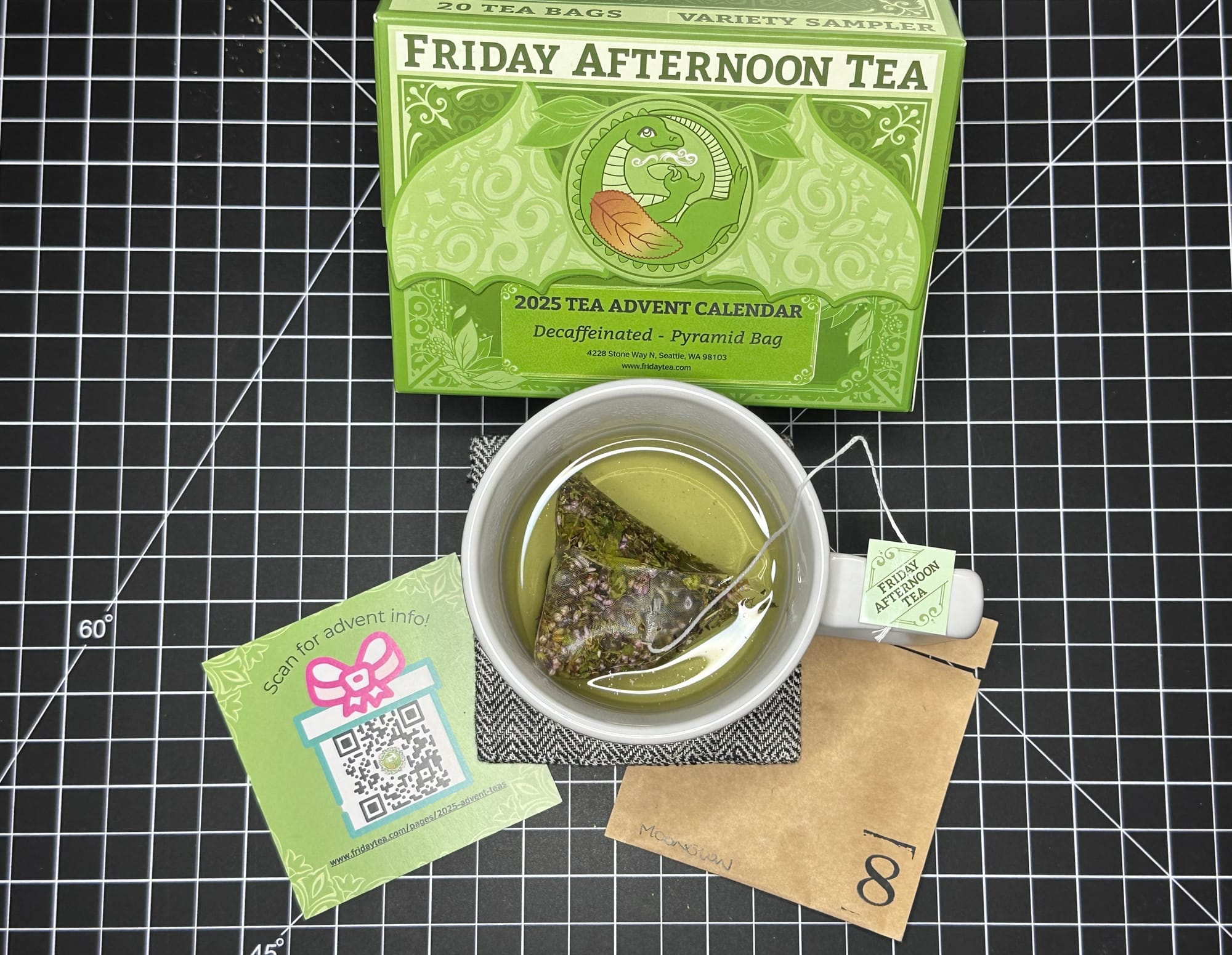Day 8 from Friday Afternoon Tea Advent (decaf, pyramid bags) is Moonglow. There might have been a sparkly moon in it, but it's hard to tell when it's in a bag. The ingredients were 90% stuff I've never had before: Heather flower, lemon myrtle, moon sprinkles*, lavender, yarrow flower (*Moon sprinkles contain: dextrose, corn starch, dextrin, magnesium stearate, confectioner's glaze, mica-based pearlescent pigments, carnuba wax).