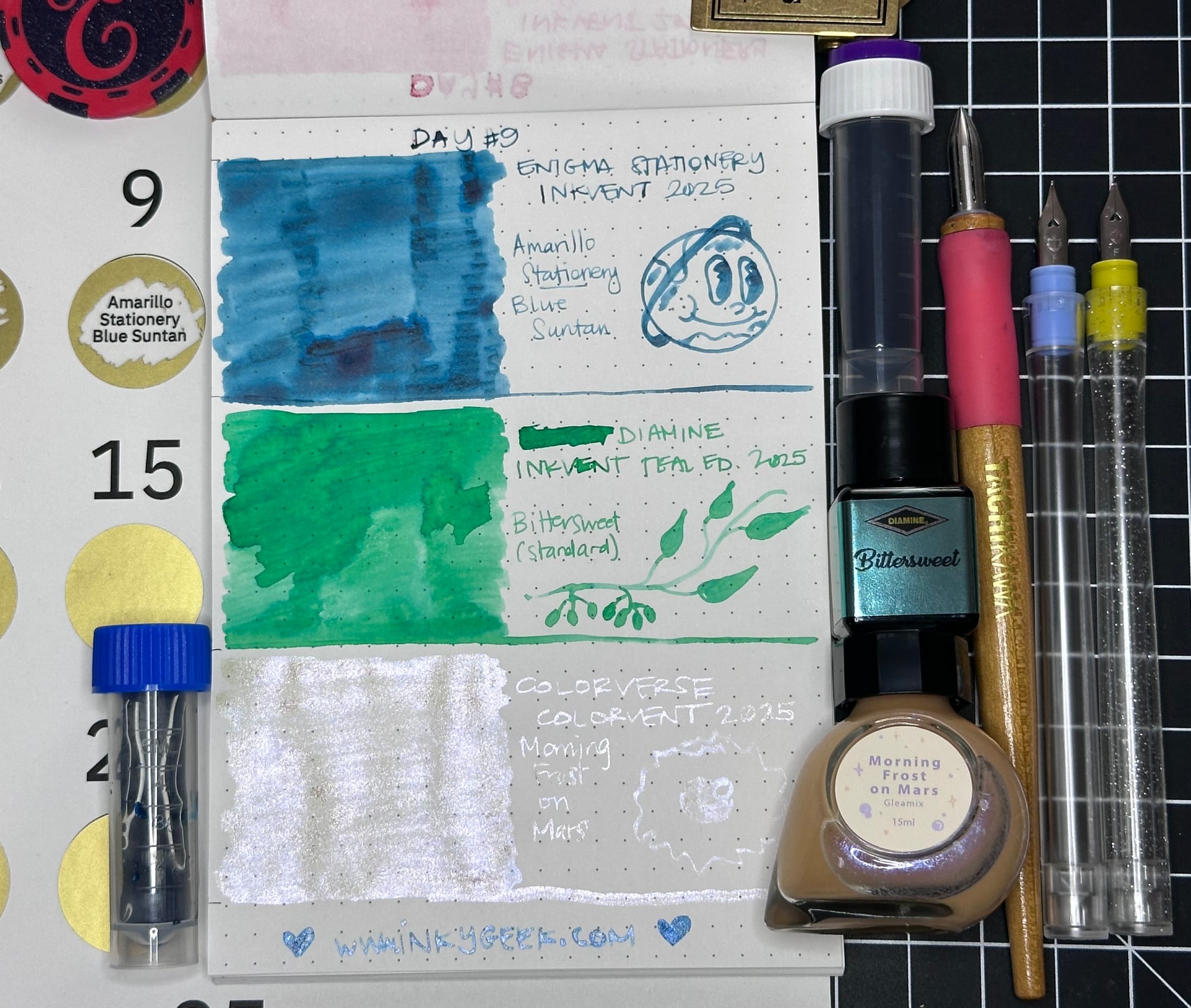 First one up is Enigma Stationery Inkvent 2025 Day 9, Amarillo Stationery Blue Suntan. This is an ink that another small stationery store made to be the blue colour of their world mascot. It's a desaturated, slightly dusty, not too watery teal blue that has a lot of shading. There could be some light sheen on papers that bring it out, but I don't think it's a feature of this ink. The doodle is of their mascot.