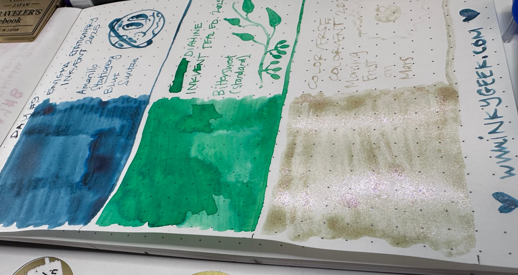 Lastly, we have a not exactly an ink. Colorverse Colorvent 2025 Day 9 is Morning Frost on Mars, a sparkle/shimmer additive for other inks they call Gleamix, but with a lot of shaking and heavy application, I was able to get some legibility out of it on its own. The base is nearly clear when allowed to settle, but on the page, there's a pearly pink/warm taupe sort of base colour to the shimmer which has a blue and pinky-purple flash to it. It's a more complex version of yesterday's watercolour! I do want to call out that the shimmer/sparkle in this ink is a pasty consistency and needs to be shaken very thoroughly. It also clogs up in the very narrow neck of the small Colorvent bottles.