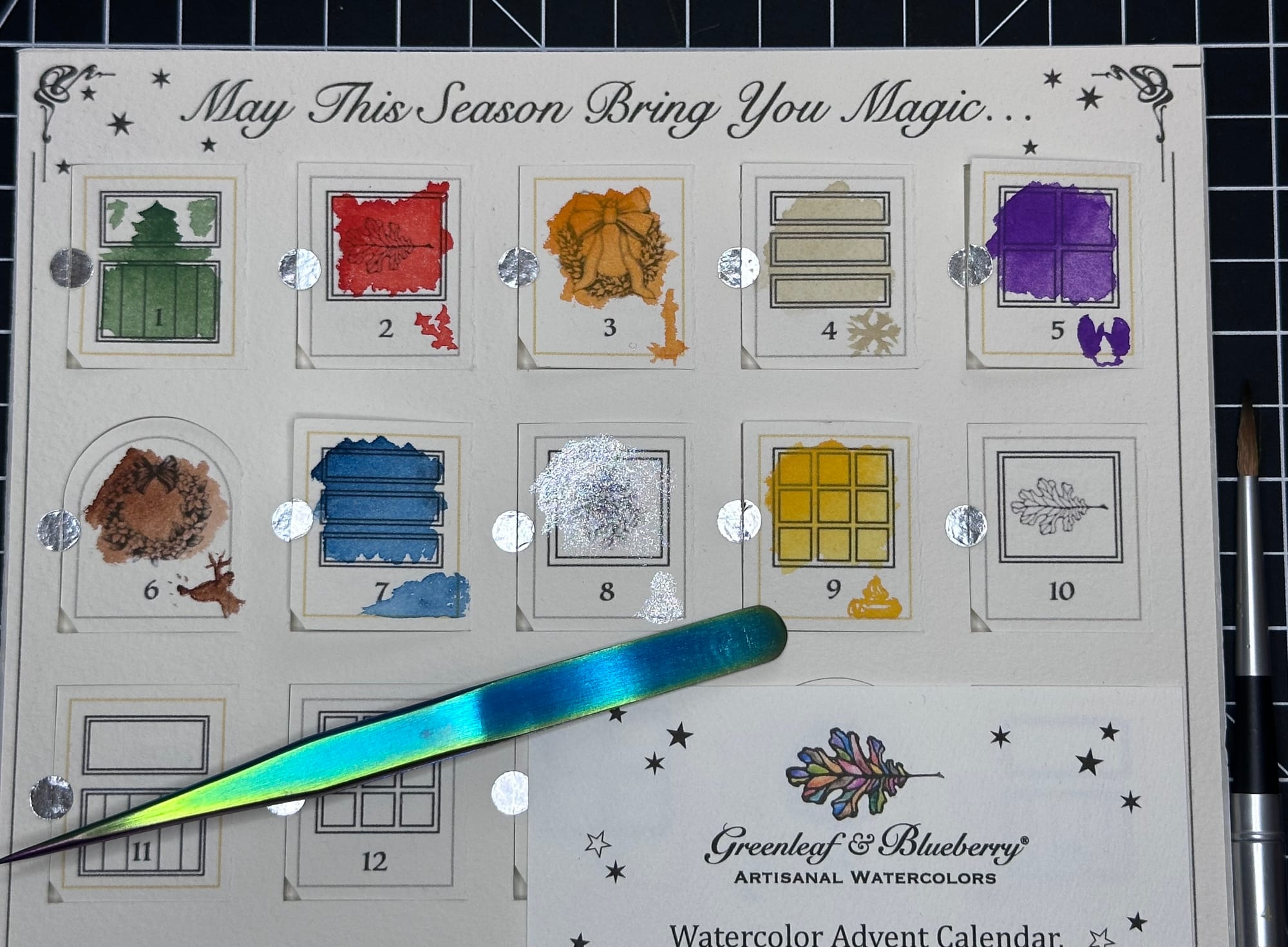 In the swatch it is very opaque when full strength (a buttery, pasty mix) and very glowy when diluted with water & wetted out. The doodle from far away looks kind of like the poop emoji, but it's supposed to be a log with a fire atop it. I think the only subjects that don't look like blobs are Day 6's Rudolph, Day 5's mittens & Day 1's tree, but wow, it's a definite challenge to make something not look like a poop or a blob when it's this small, all in one colour.