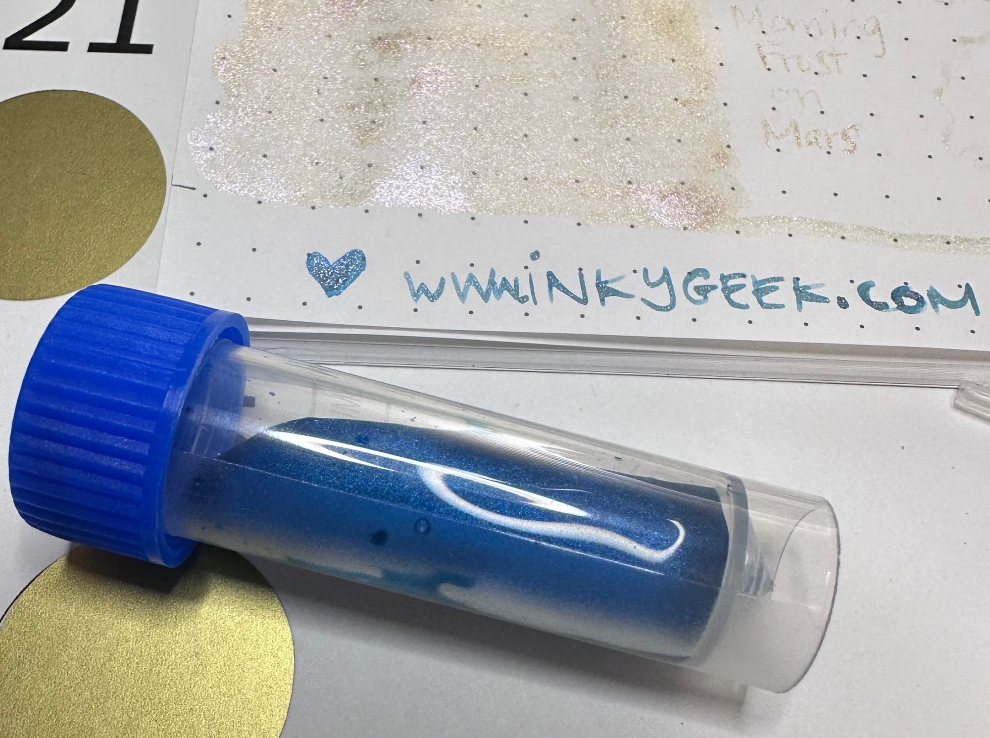 Here's a bonus photo of a mixed version of the Colorverse Morning Frost on Mars Gleamix mixed with some of the sample of Amarillo Stationery Blue Suntan from Enigma Stationery. That is what's in the blue-capped vial and I wrote the URL with this mixture. I probably added too much Gleamix to the tiny amount of ink, but can you ever have too much sparkle?