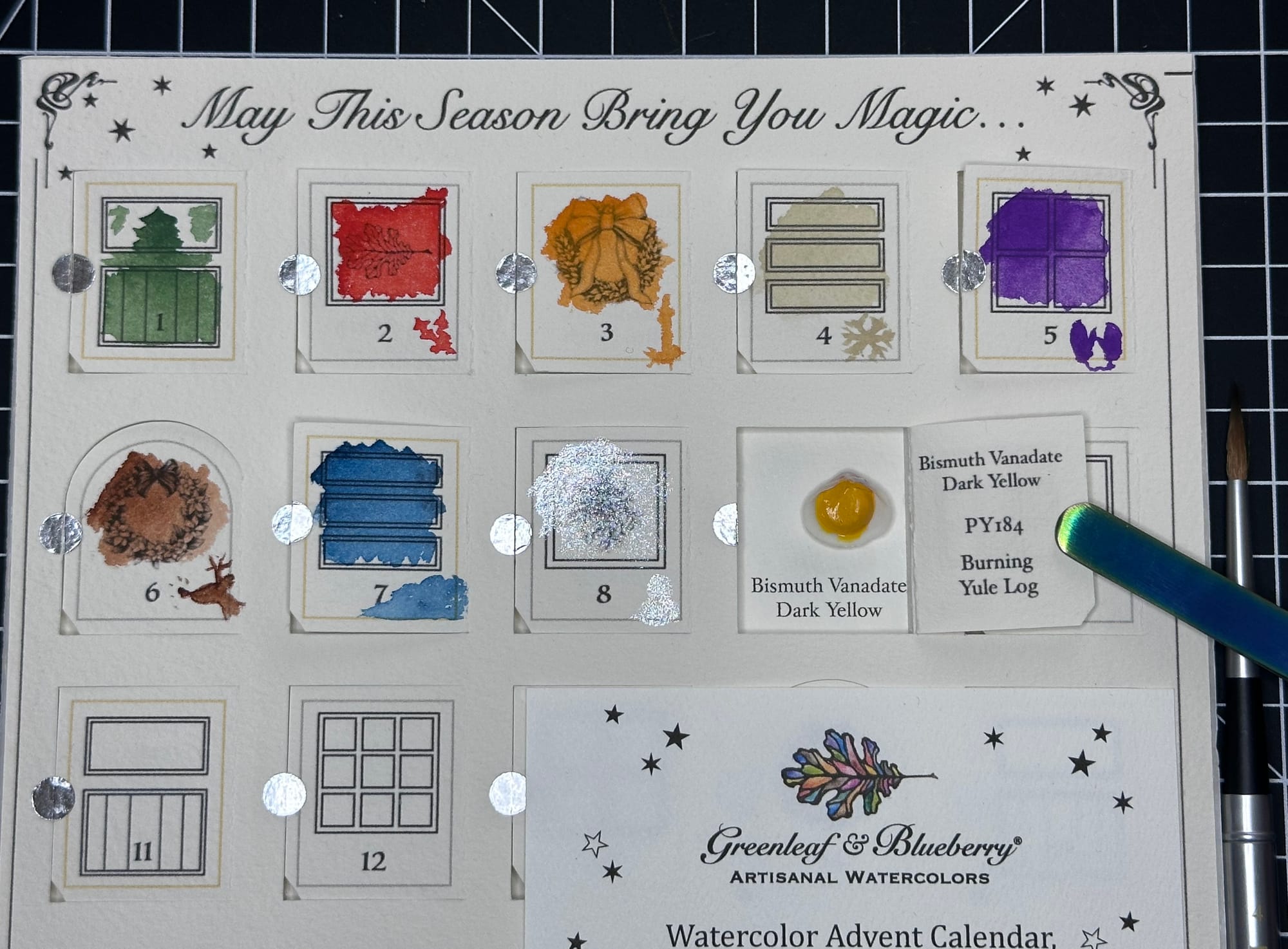 Day 9 of the Greenleaf & Blueberry Watercolour Advent Calendar in Shells 2025 is Bismuth Vanadate Dark Yellow, PY184. There isn't any info on Greenleaf & Blueberry about this paint, but some research into the pigment seems to say that it's another organic-inorganic pigment hybrid. It's a slightly dry feeling (not gritty) paint that is creamy when wetted.